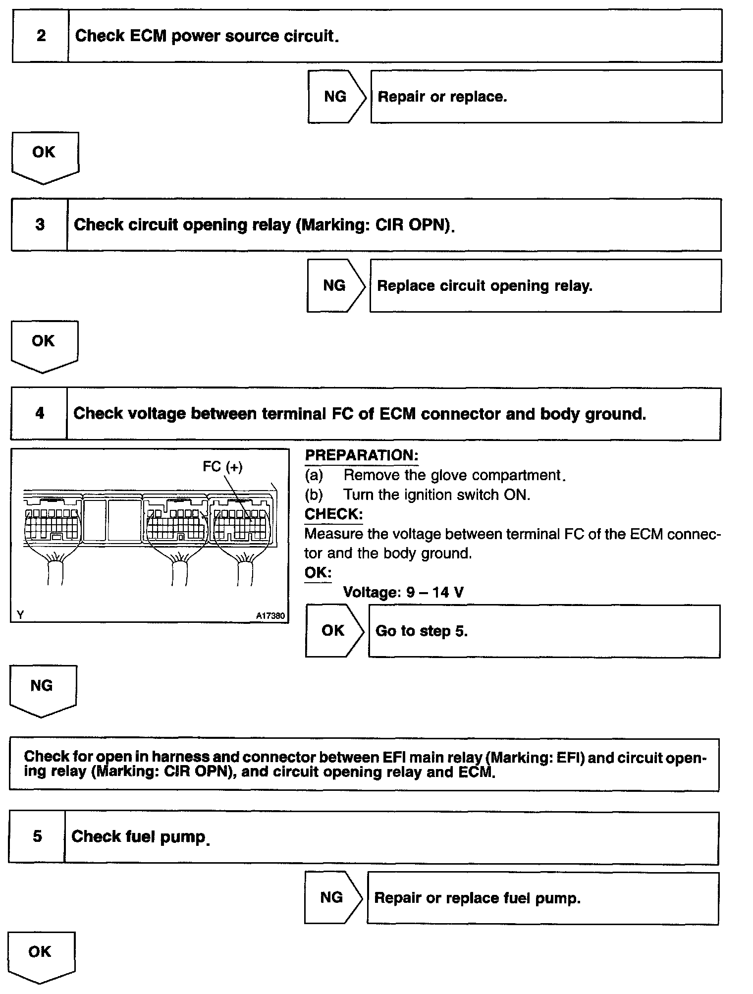 When the STA signal and NE signal are input to the ECM, Tr is turned on, current flows to the coil of the circuit opening relay (Marking: CIR OPN), the relay switches on, power is supplied to the fuel pump and the fuel pump operates.