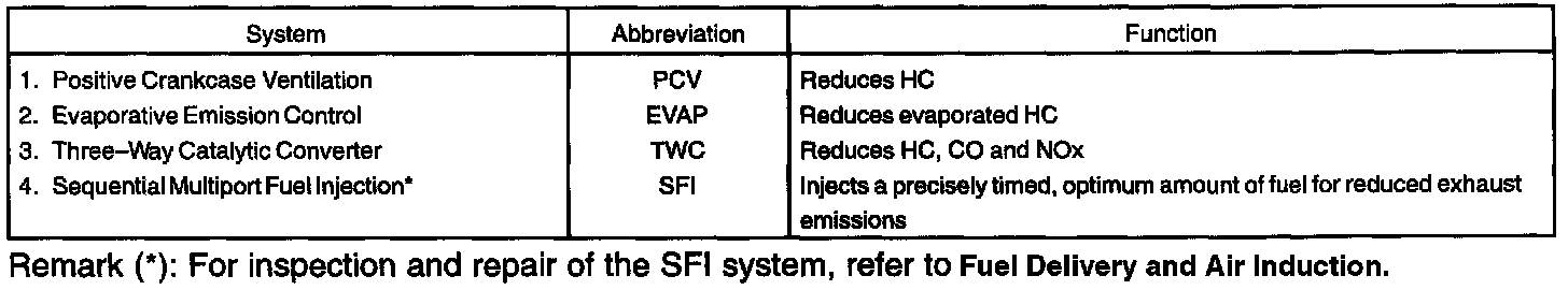 PURPOSEThe emission control systems are installed to reduce the amount of HC, CO and NOx exhausted from the engine (3 and 4), to prevent the atmospheric release of blow-by gas-containing HC (1) and evaporated fuel containing HC being released from the fuel tank (2).