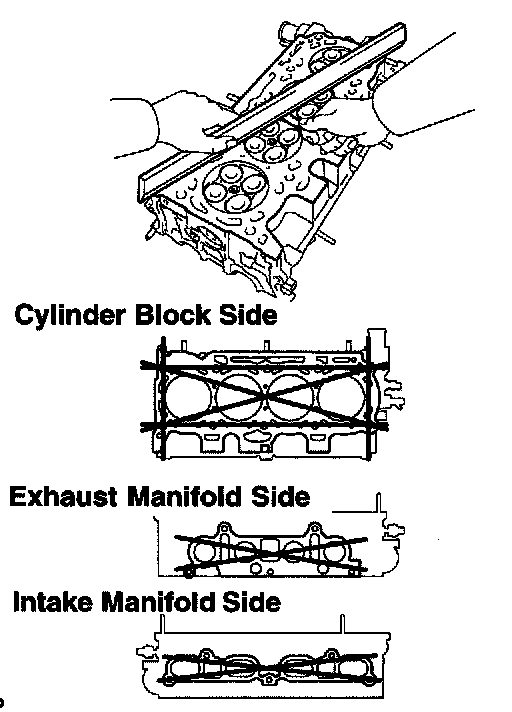 Using a precision straight edge and feeler gauge, measure the surface contacting the cylinder block and the manifolds for warpage.
