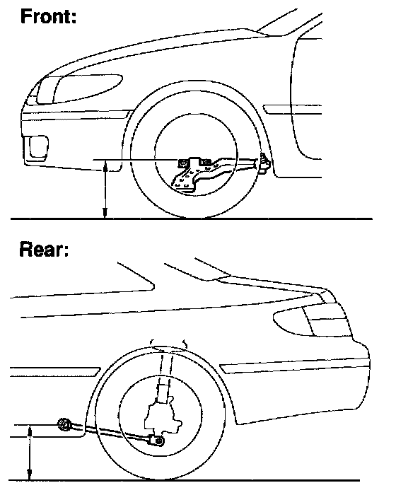Measure the distance from the ground to the center of the front side lower suspension arm mounting bolt.
