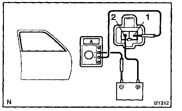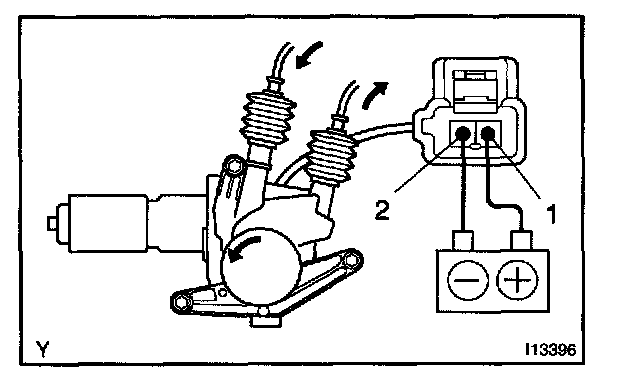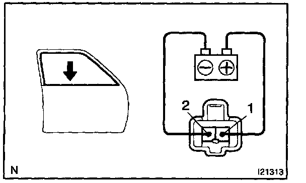 a. Connect the positive (+) lead from the battery to terminal 2 and the negative (-) lead to terminal 1, and check that the motor turns window up direction.