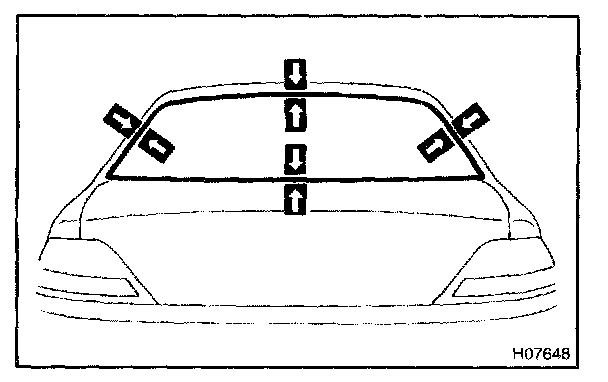 b. Hold the back window glass in place securely with a protective tape or equivalent until the adhesive hardens.