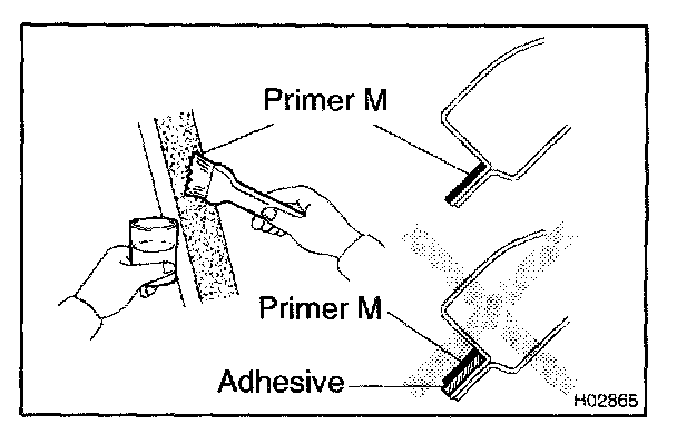 a. Using a brush or sponge, coat the edge of the glass and the contact surface with Primer G as shown in the illustration.