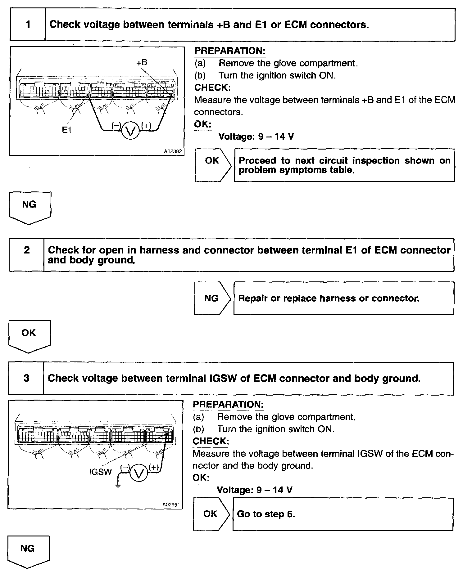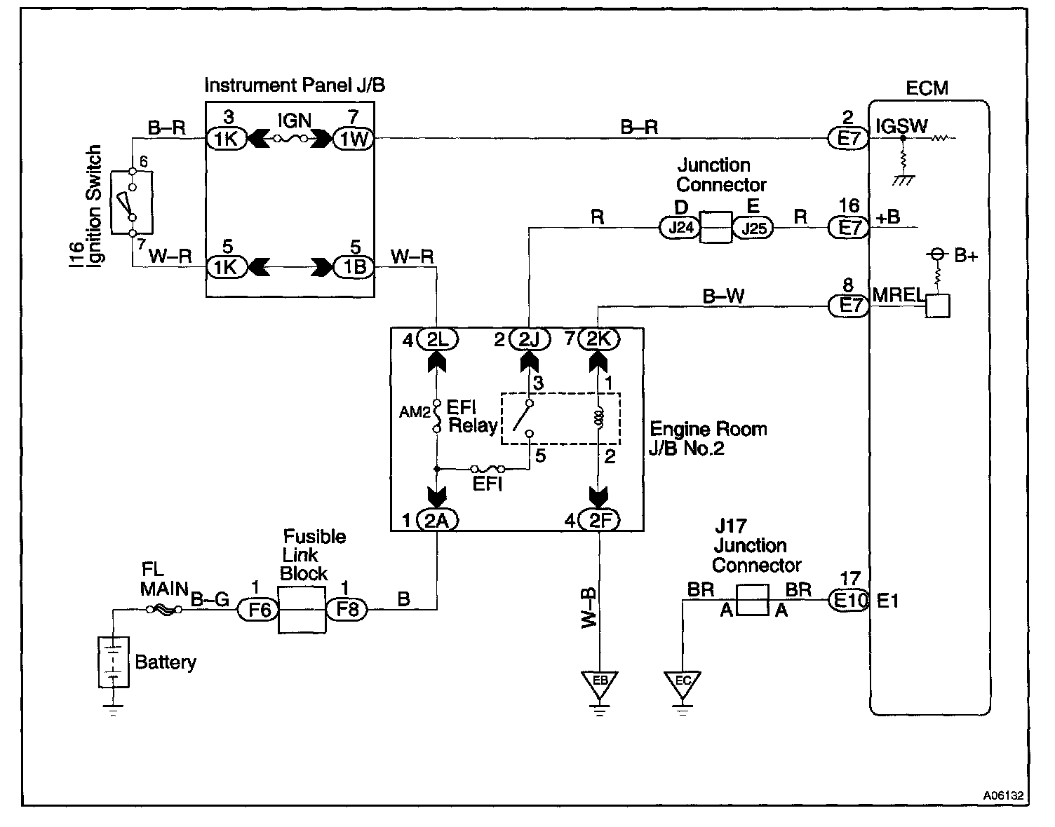 This signal causes current to flow to the coil, closing the contacts of the EFI main relay and supplying power to terminals +B of the ECM.