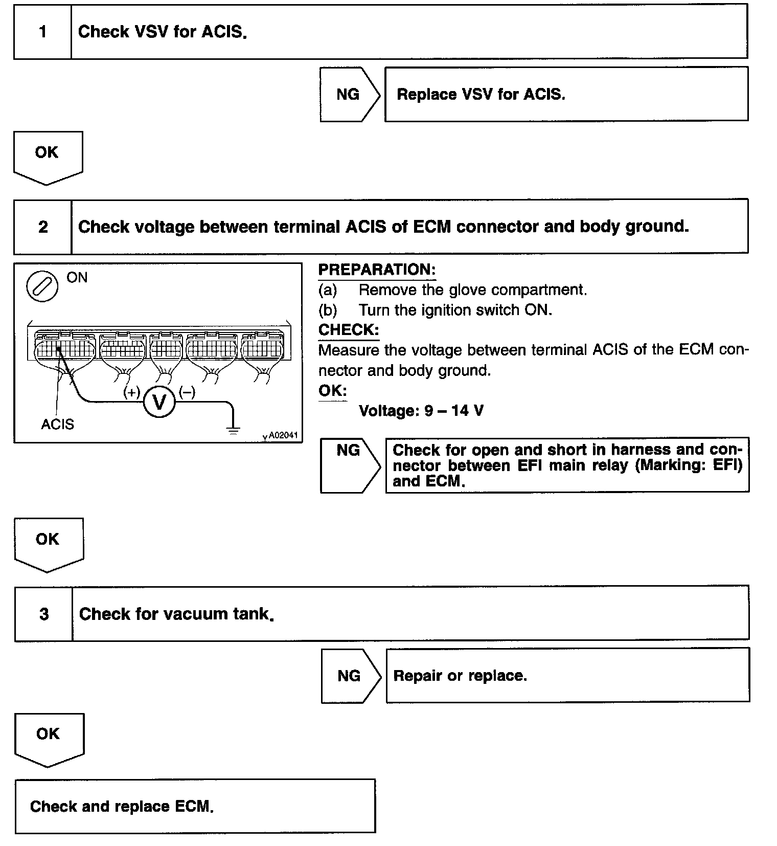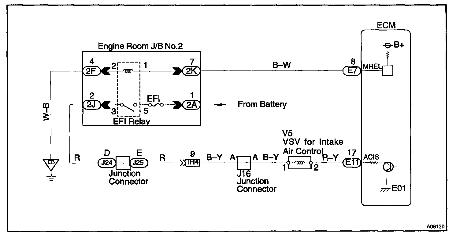 CIRCUIT DESCRIPTIONThis circuit opens and closes the IACV (Intake Air Control Valve) in response to the engine load in order to increase the intake efficiency (ACIS: Acoustic Control Induction System).