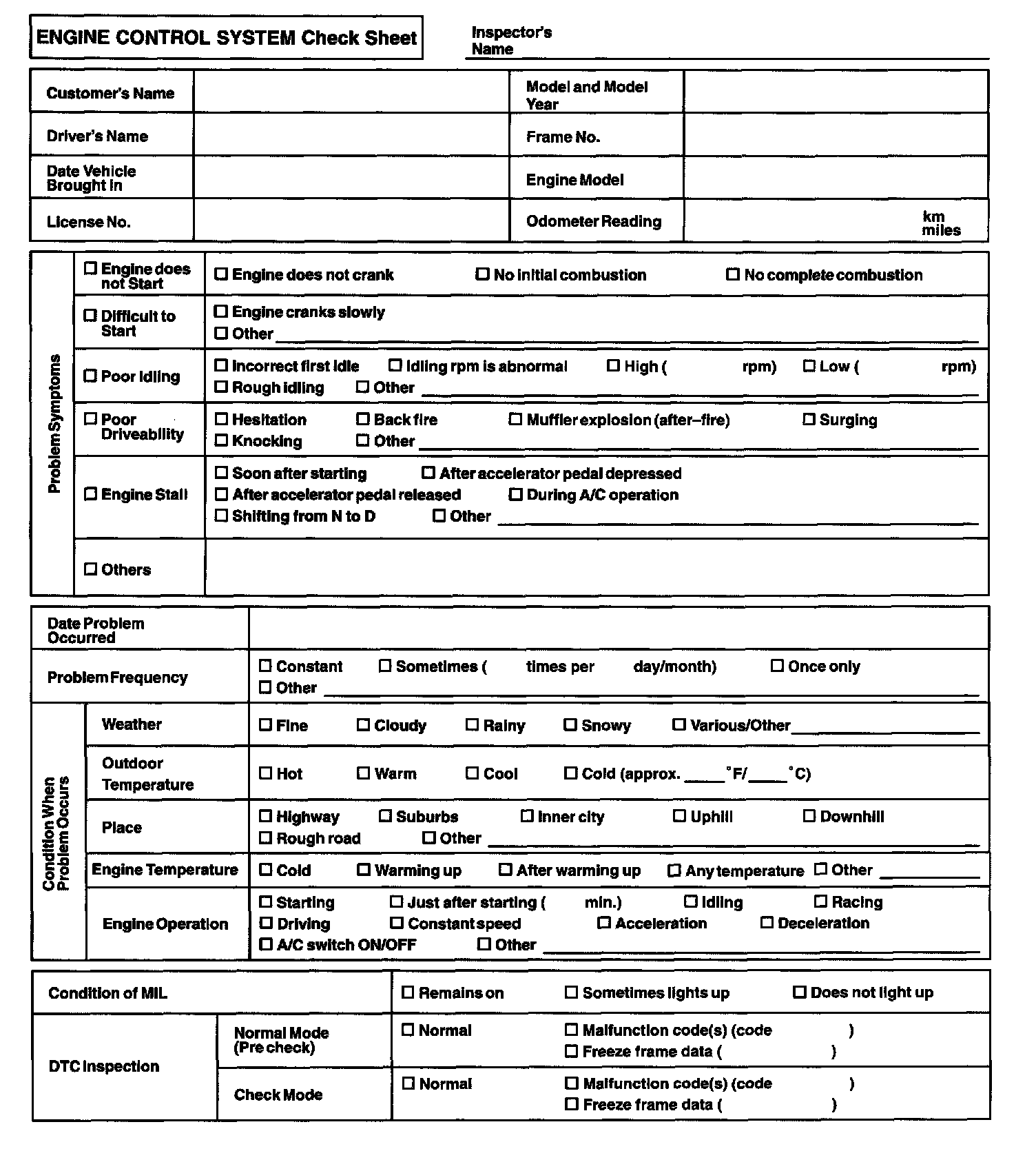 Engine Control System Check Sheet: