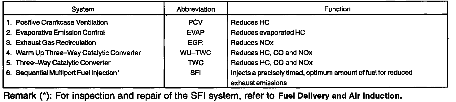 PURPOSEThe emission control systems are installed to reduce the amount of CO, HC and NOx exhausted from the engine (3,4,5 and 6), to prevent the atmospheric release of blow-by gas-containing HC (1) and evaporated fuel containing HC being released from the fuel tank (2).
