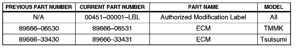 ^ Current part number listed for reference only. Current part number reflects new calibration software installed after ECM (PCM) is recalibrated with Toyota Diagnostic Tester.