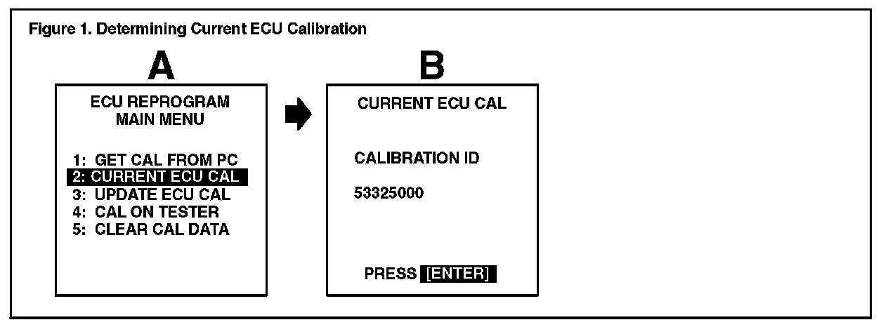 2. Connect the Diagnostic Tester to the vehicle and select CURRENT ECU CAL from the ECU REPROGRAM MAIN MENU. Determine the vehicle's current ECU calibration. (See Figure 1.)