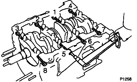 b. Install and uniformly tighten the 8 main bearing cap bolts, in several passes, in the sequence shown.