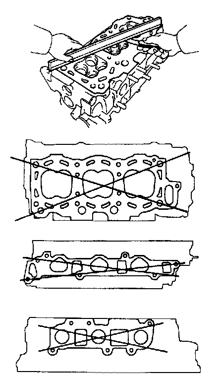 Using a precision straight edge and feeler gauge, measure the surfaces contacting the cylinder block and the manifolds for warpage.
