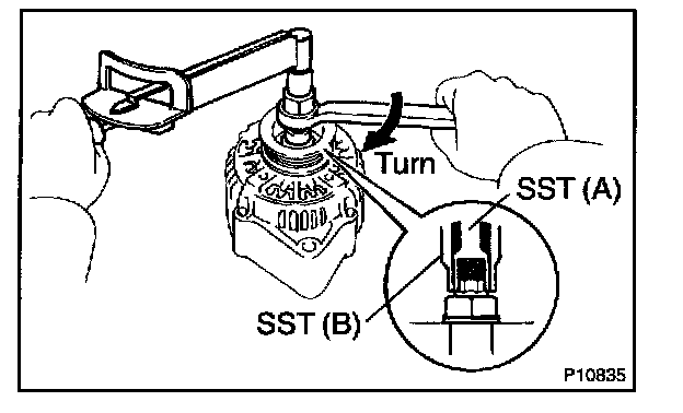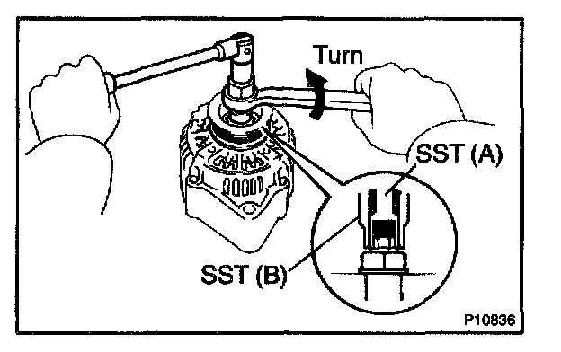 e. To loosen the pulley nut, turn SST (A) in the direction shown in the illustration.