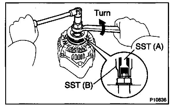 b. Hold SST (A) with a torque wrench, and tighten SST (B) clockwise to the specified torque.