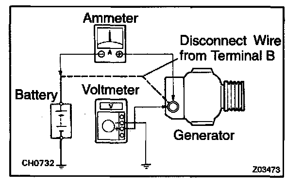 - Disconnect the wire from terminal B of the generator, and connect it to the negative (-) tester probe of the ammeter.