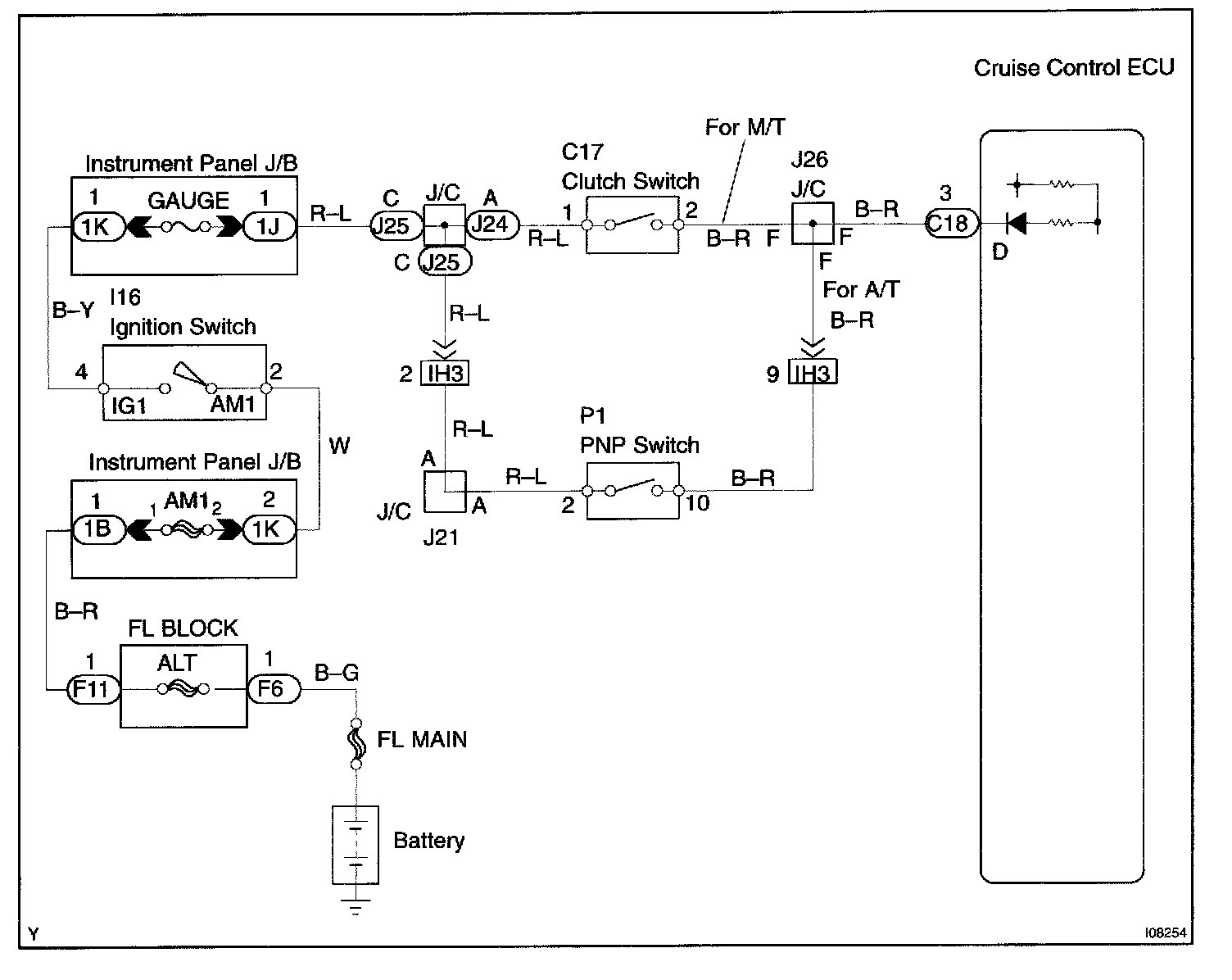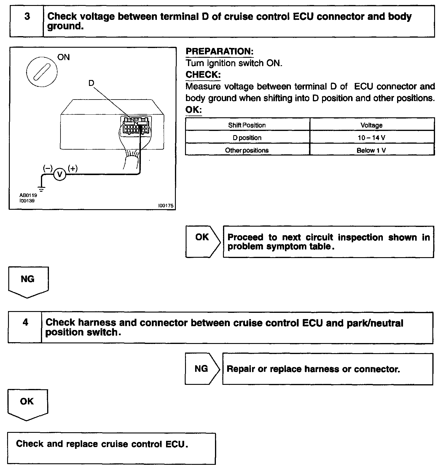 CIRCUIT DESCRIPTIONWhen the shift position is except D, a signal is sent from the park/neutral position switch to the ECU. When this signal is input during cruise control driving, the ECU cancels the cruise control.