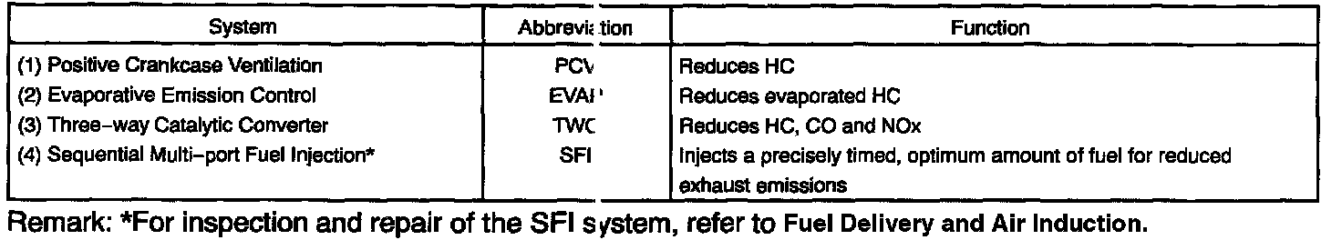 PURPOSEThe emission control systems are installed to reduce the amount of CO, HC and NOx exhausted from the engine ((3) and (4)), to prevent the atmospheric release of blow-by gas-containing HC (1) and evaporated fuel containing HC being released from the fuel tank (2).
