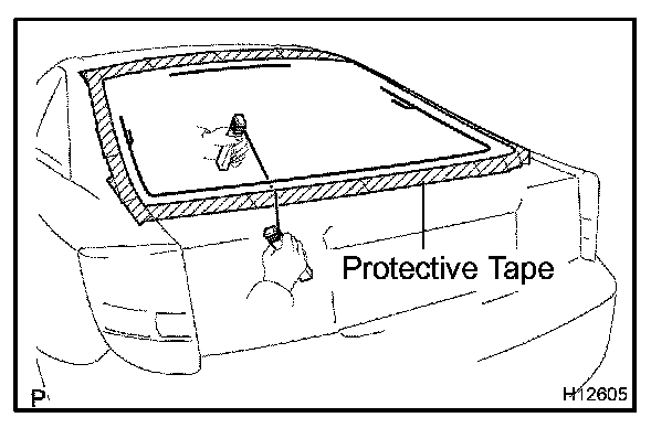 b. Hold the back door glass in place securely with a protective tape or equivalent until the adhesive hardenes.