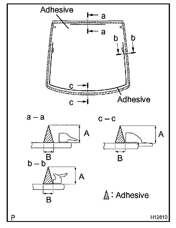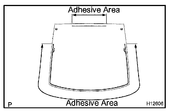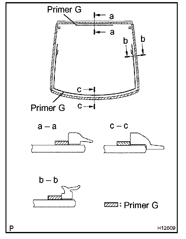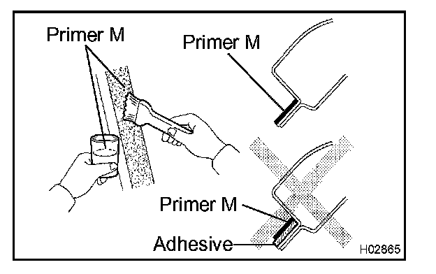a. Using a brush or sponge, coat the edge of the glass and the contact surface with Primer G as shown in the illustration.