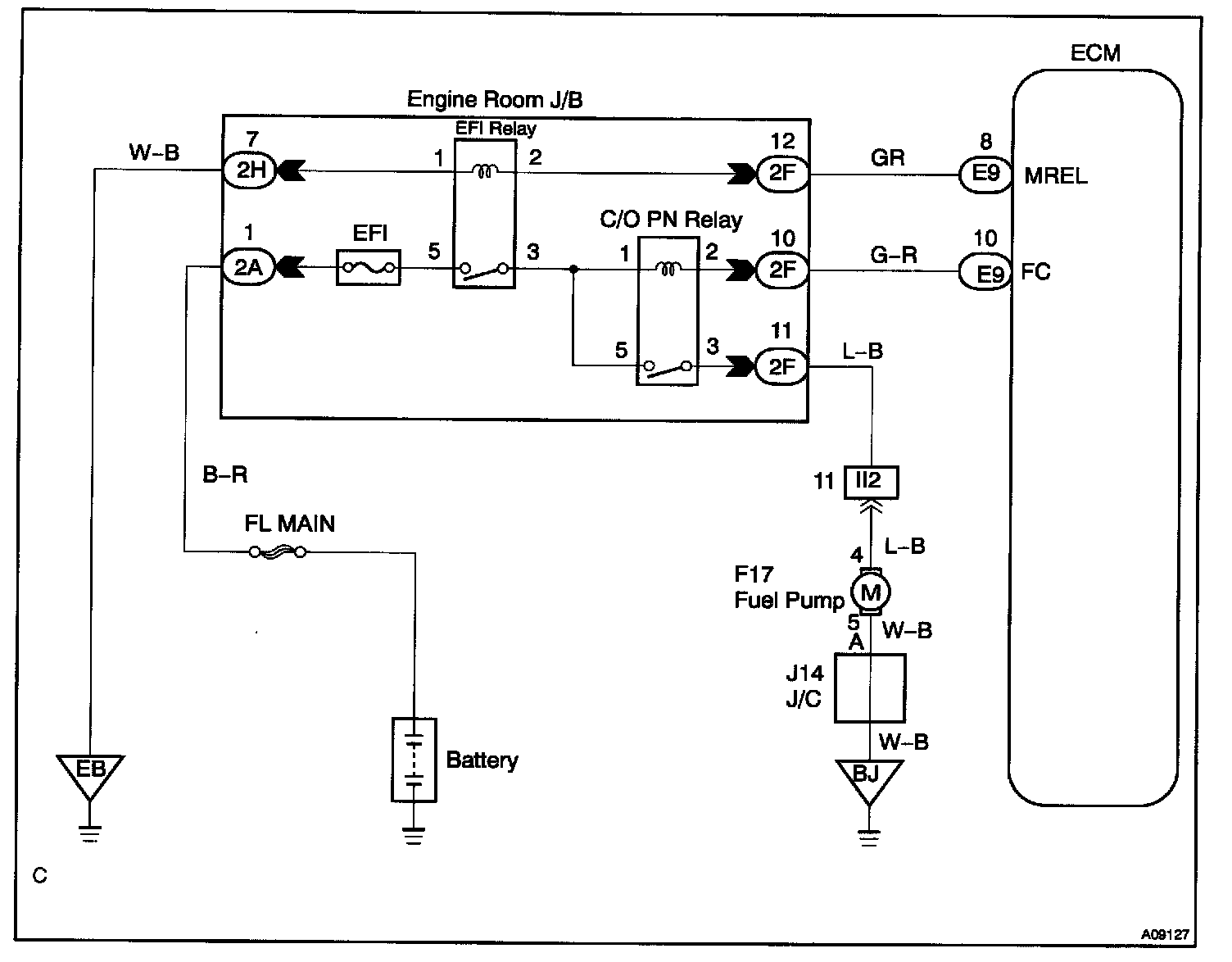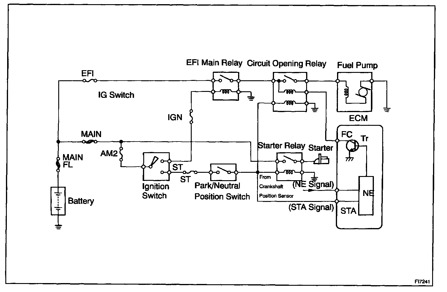CIRCUIT DESCRIPTIONIn the diagram, when the engine is cranked, current flows from terminal ST of the ignition switch to the starter relay coil and also current flows to terminal STA of ECM (STA signal).
