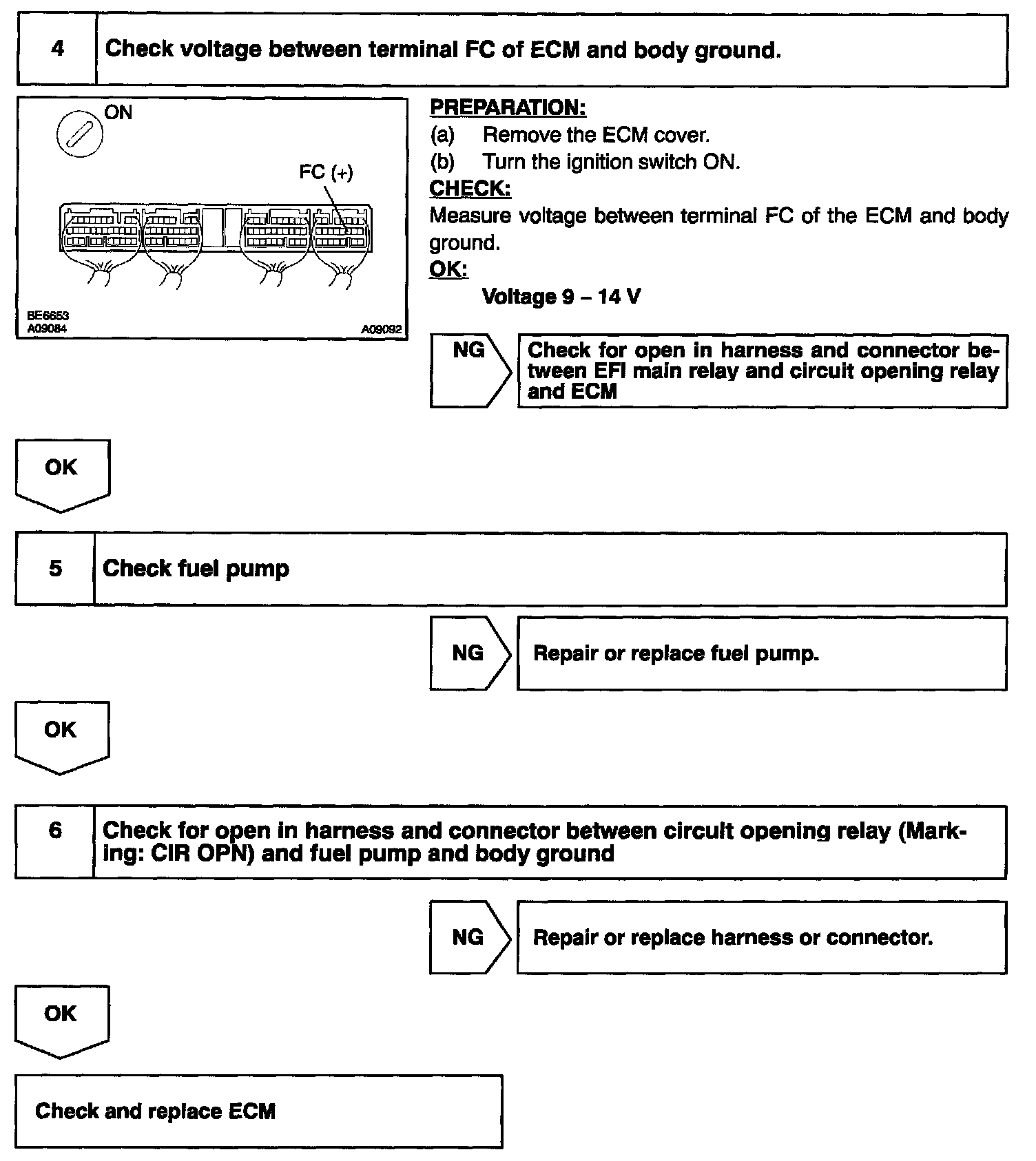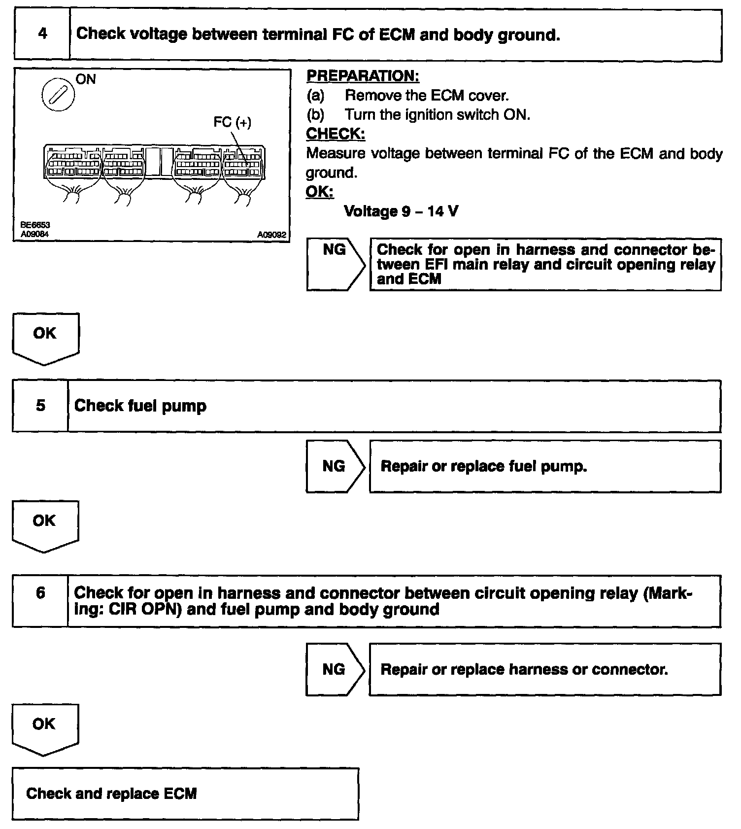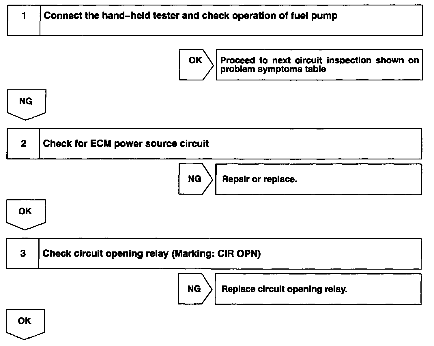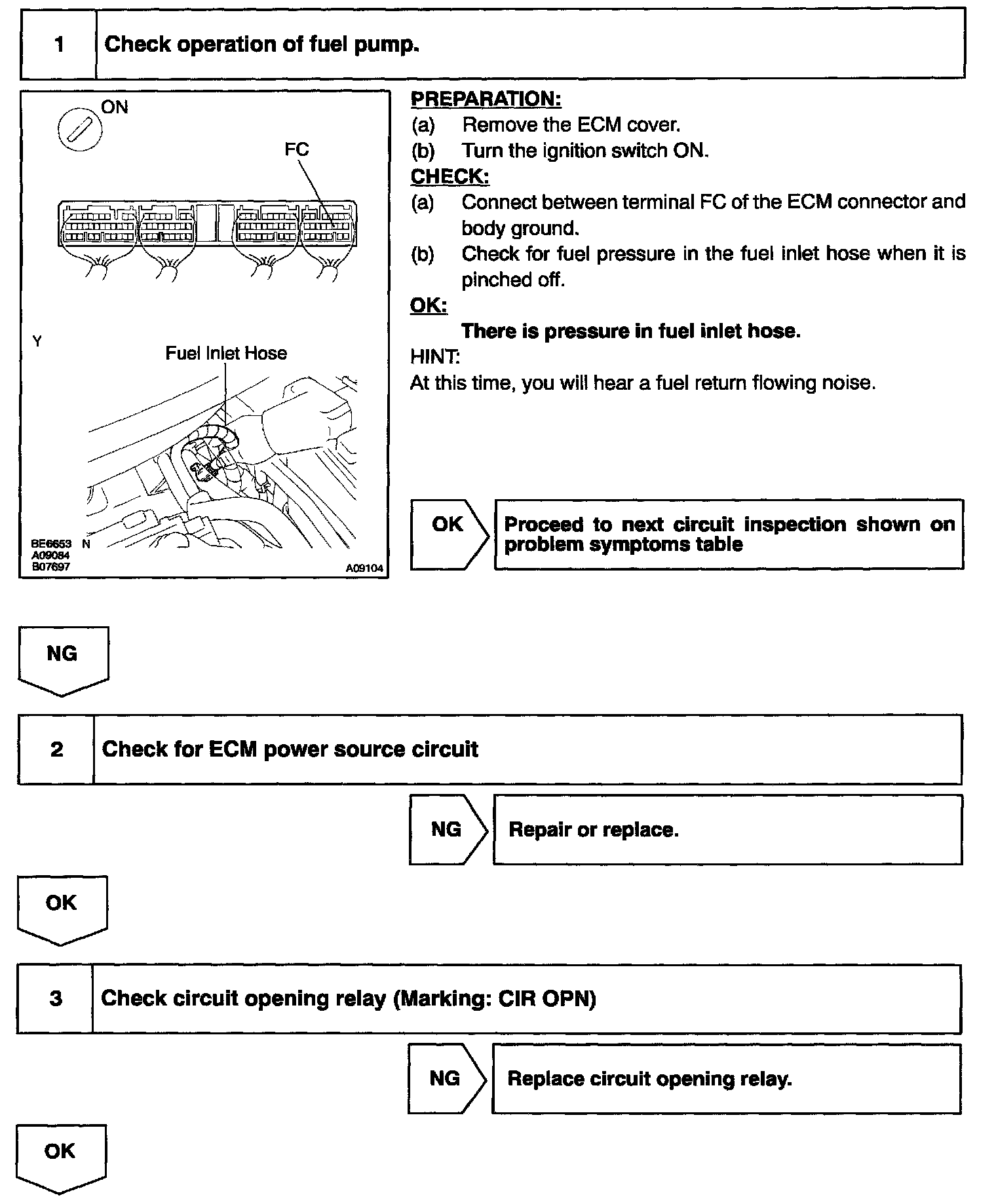 When the STA signal and NE signal are input to the ECM, Tr is turned ON, current flows to coil of the circuit opening relay, the relay switches on, power is supplied to the fuel pump and the fuel pump operates. While the NE signal is generated (engine running), the ECM keeps Tr ON (circuit opening relay ON) and the fuel pump also keeps operating.