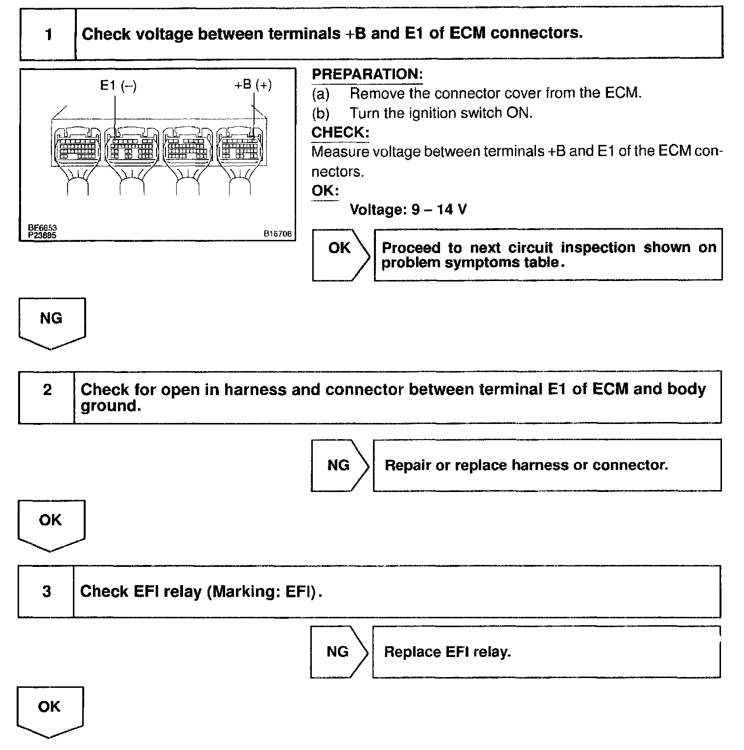 CIRCUIT DESCRIPTIONWhen the ignition switch is turned ON, battery positive voltage is applied to the coil, closing the contacts of the EFI main relay (Marking: EFI) and supplying power to terminal +B of the ECM.