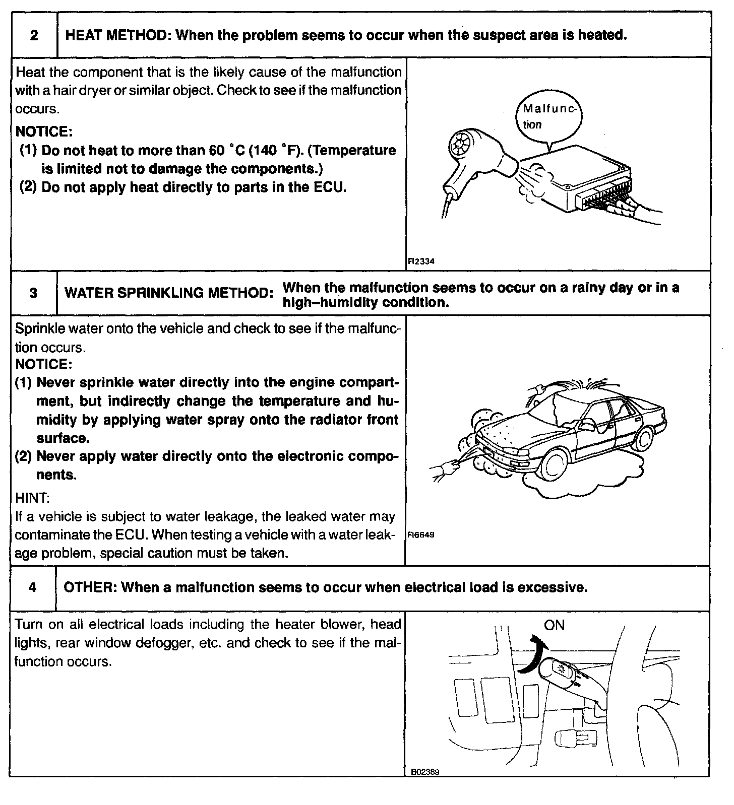 The most difficult case in troubleshooting is when there are no problem symptoms occurring. In such cases, a thorough customer problem analysis must be carried out, then simulate the same or similar conditions and environment in which the problem occurred in the customer's vehicle. No matter how much experience a technician has, or how skilled he may be, if he proceeds to troubleshoot without confirming the problem symptoms he will tend to overlook something important in the repair operation and make a wrong guess somewhere, which will only lead to a standstill. For example, for a problem which only occurs when the engine is cold, or for a problem which occurs due to vibration caused by the road during driving, etc., the problem can never be determined so long as the symptoms are confirmed with the engine hot condition or the vehicle at a standstill. Since vibration, heat or water penetration (moisture) is likely cause for problem which is difficult to reproduce, the symptom simulation tests introduced here are effective measures in that the external causes are applied to the vehicle in a stopped condition.