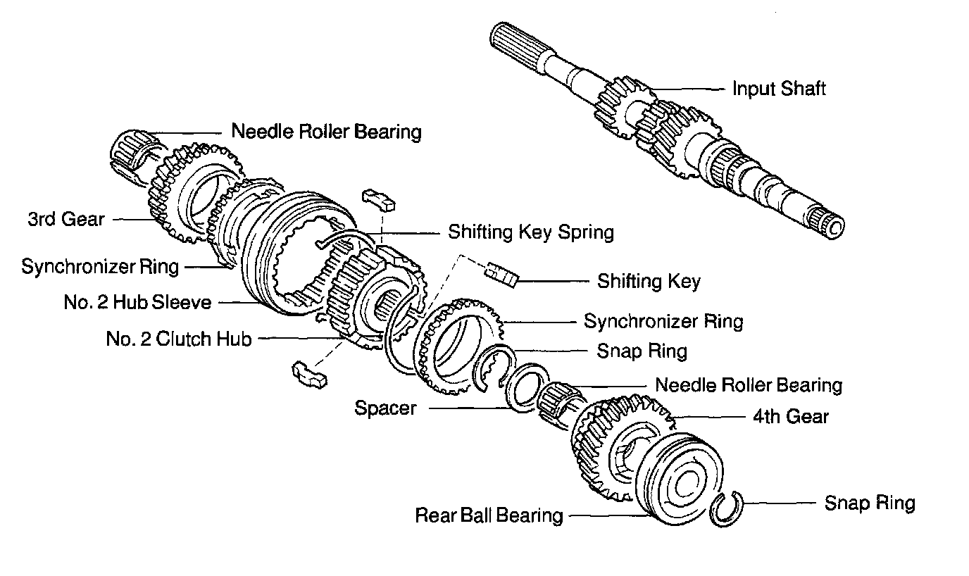 4. REMOVE REAR BALL BEARING, 4TH GEAR, NEEDLE ROLLER BEARING, SPACER AND SYNCHRONIZER RING FROM INPUT SHAFT