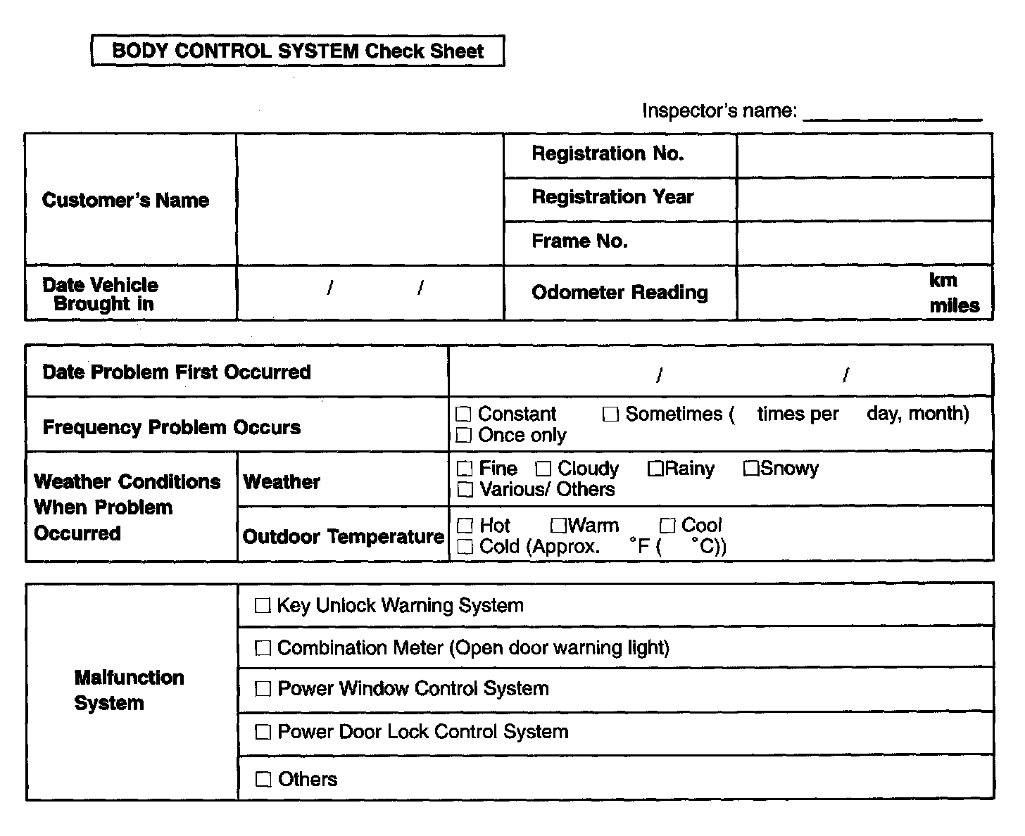 Body Control System Check Sheet: