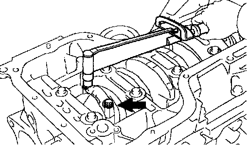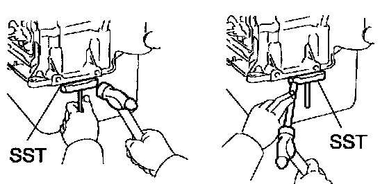 b. Insert the blade of SST between the bearing cap subassembly and oil pan, and cut off applied sealer and remove the oil pan.