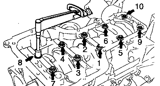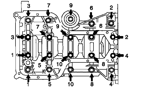 b. Uniformly loosen and remove the 10 bearing cap bolts in several passes, in the sequence shown.