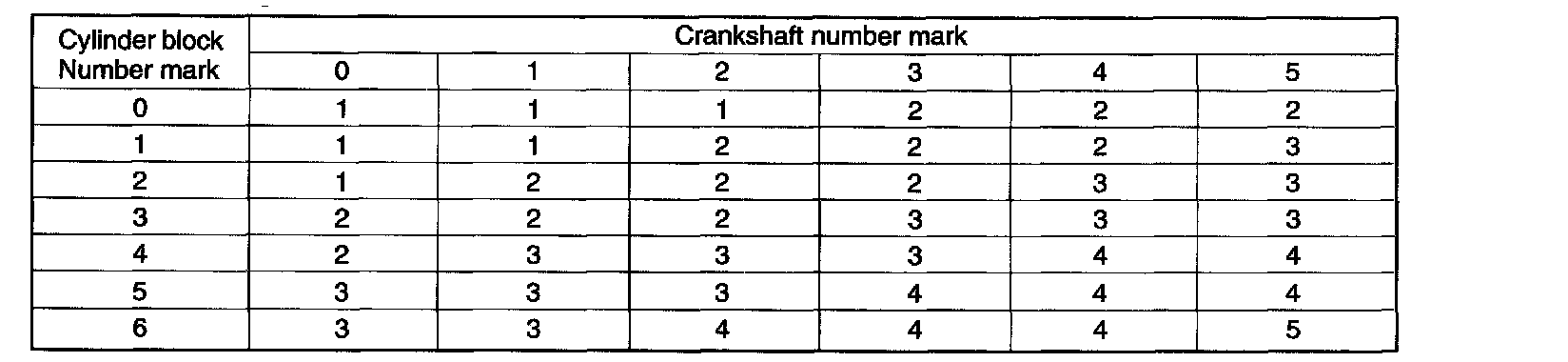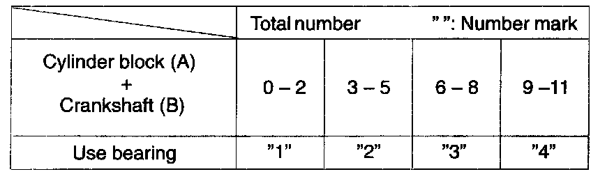 m. If using a standard bearing, replace it with one having the same number. If the number of the bearing cannot be determined, select the correct bearing by adding together the numbers imprinted on the cylinder block and crankshaft, then selecting the bearing with the same number as the total. There are 4 sizes of standard bearings, marked 1, 2, 3 and 4 accordingly.