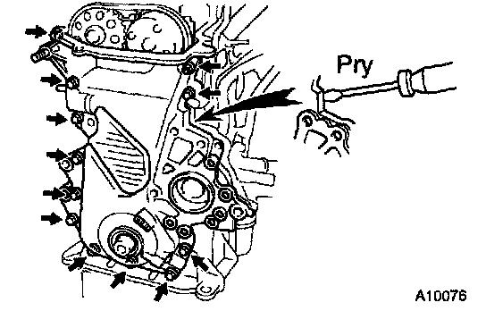 b. Using a screwdriver, pry between the timing chain cover and cylinder head or cylinder block.