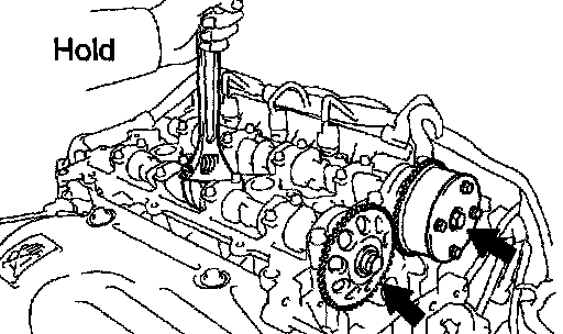 a. Hold the hexagonal head wrench portion of the camshaft with a wrench, and loosen the sprocket.