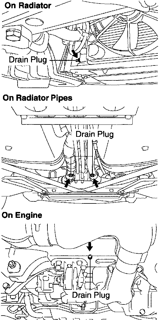 d. Remove the drain plugs (radiator, radiator pipes and engine), and drain the coolant.