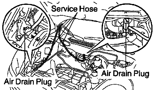 1) Connect the service hoses to the air drain plug of the radiator and heater water valve.