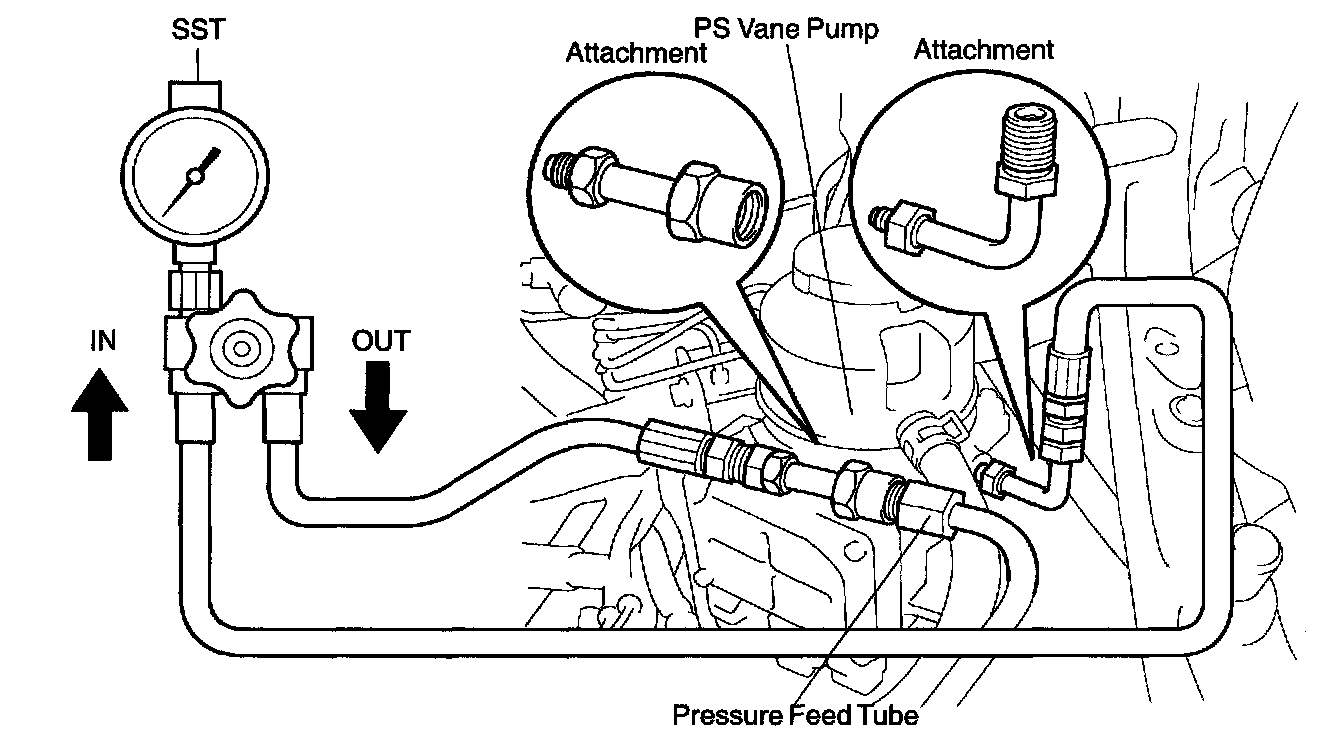 f. With the engine idling, close the valve of the SST and observe the reading on the SST.