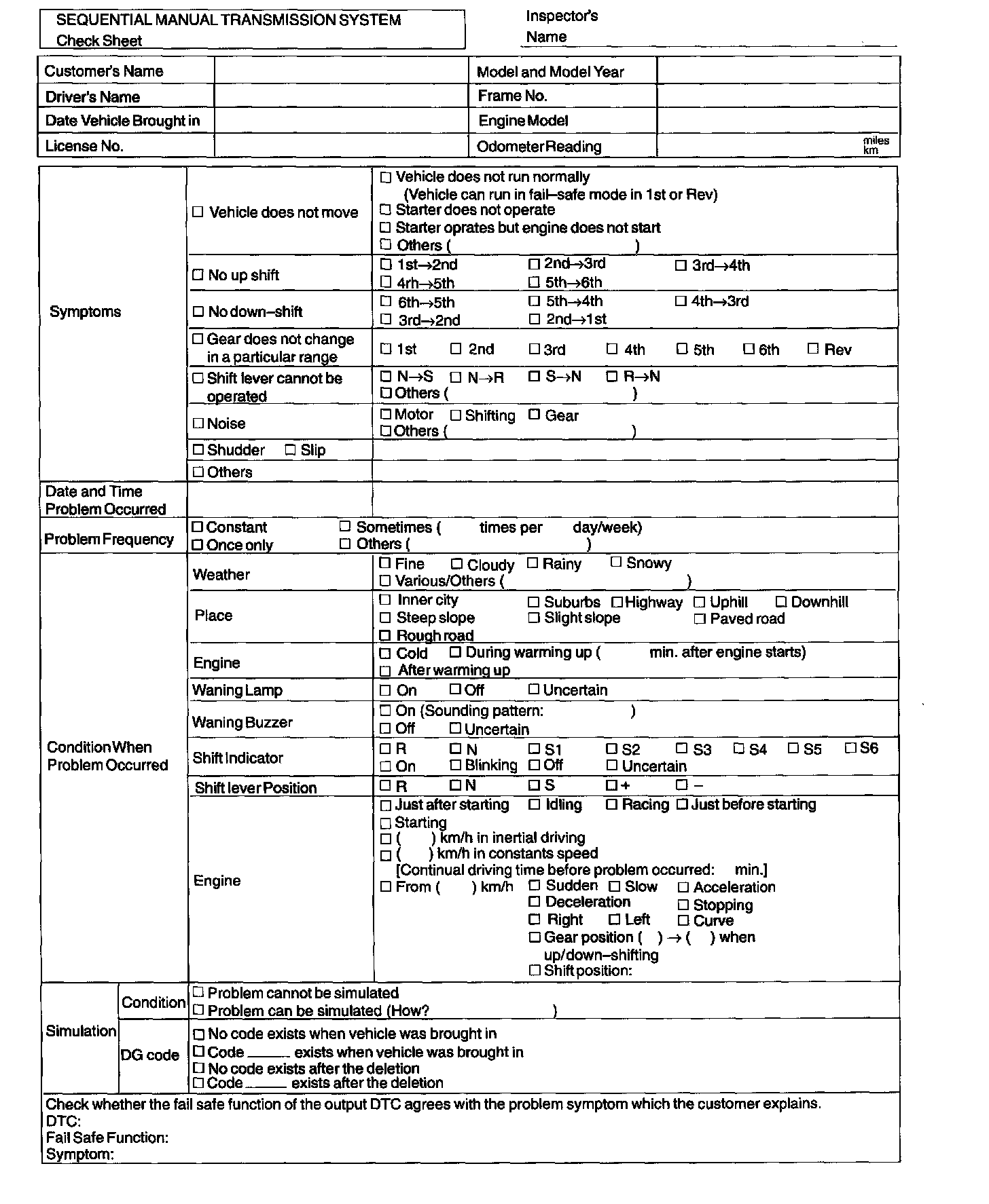Sequential Manual Transmission System Check Sheet: