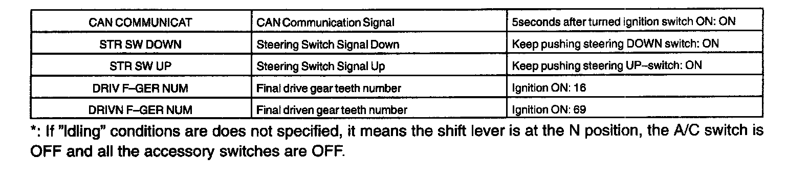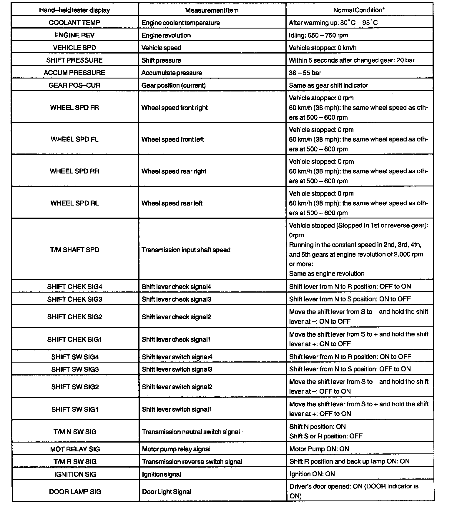 SEQUENTIAL MANUAL TRANSMISSION OPERATING CONDITIONNOTE: The values given for "Normal Condition" are representative values, so a vehicle may still be normal even if its value differs from those listed here. So do not depend solely on the "Normal Condition" here when deciding whether the part is faulty or not.