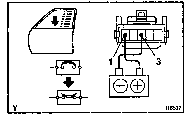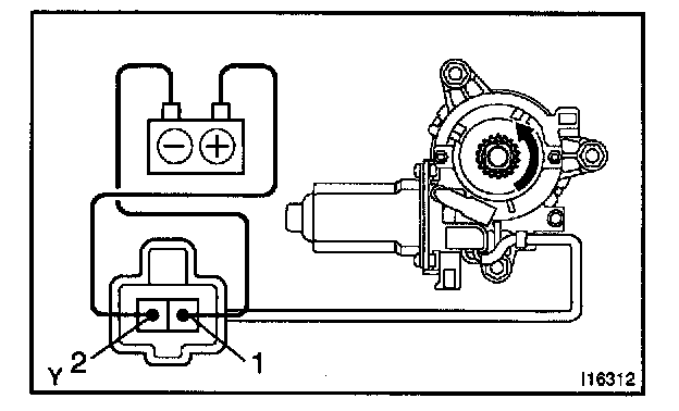 b. Connect the positive (+) lead from the battery to terminal 3 and the negative (-) lead to terminal 1 on the wire harness side connector, and raise the window to fully closed position.