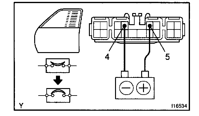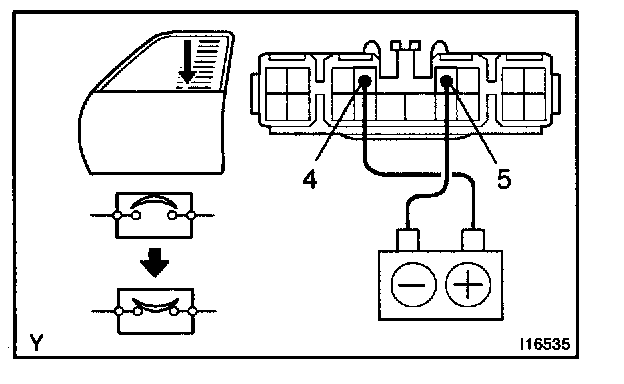b. Connect the positive (+) lead from the battery to terminal 5 and the negative (-) lead to terminal 4 on the wire harness side connector, and raise the window to fully closed position.
