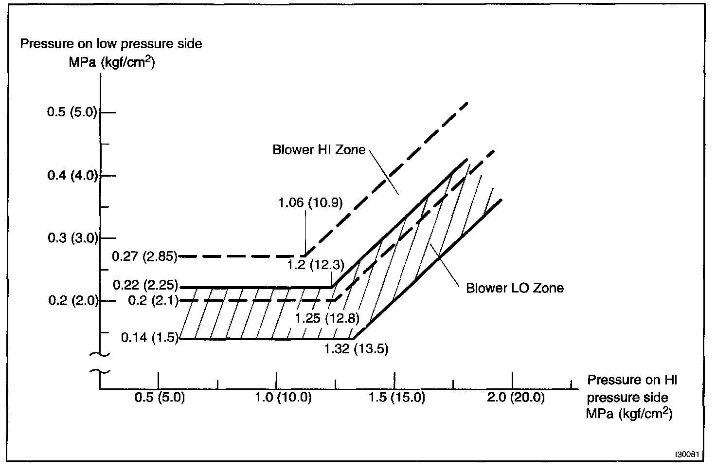 Low pressure side: 0.15 -0.25 MPa (1.5 - 2.5 kgf/sq.cm)