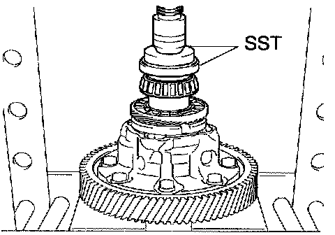 a. Using SST and a press, install a new FR differential case front tapered roller bearing (inner race) to the front differential case.