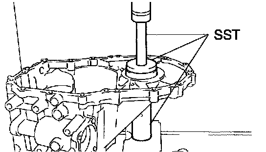 b. Using SST and a press, install a new FR differential case front tapered roller bearing (outer race) with shim to the transaxle case.