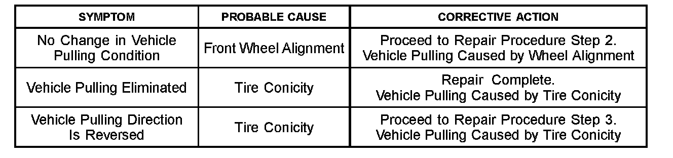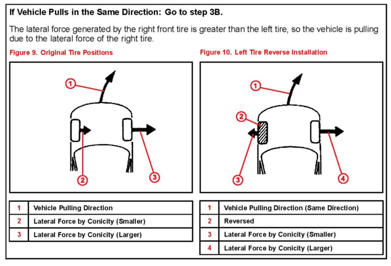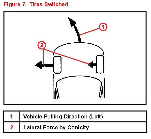 ^ If the pulling direction does not change after the front tires are switched the cause of vehicle pulling is not tire conicity. In this case the likely cause is a front wheel alignment condition.