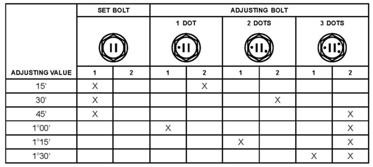 Adjusting value for the set bolts is 6' - 30' (0.1° 0.5°). When making an adjustment of more than 45' replace the upper and lower steering knuckle set bolts with the adjusting bolts. If the camber is NOT within the specification, use the table shown to estimate how much additional camber adjustment will be required, and select the appropriate camber adjusting bolt.