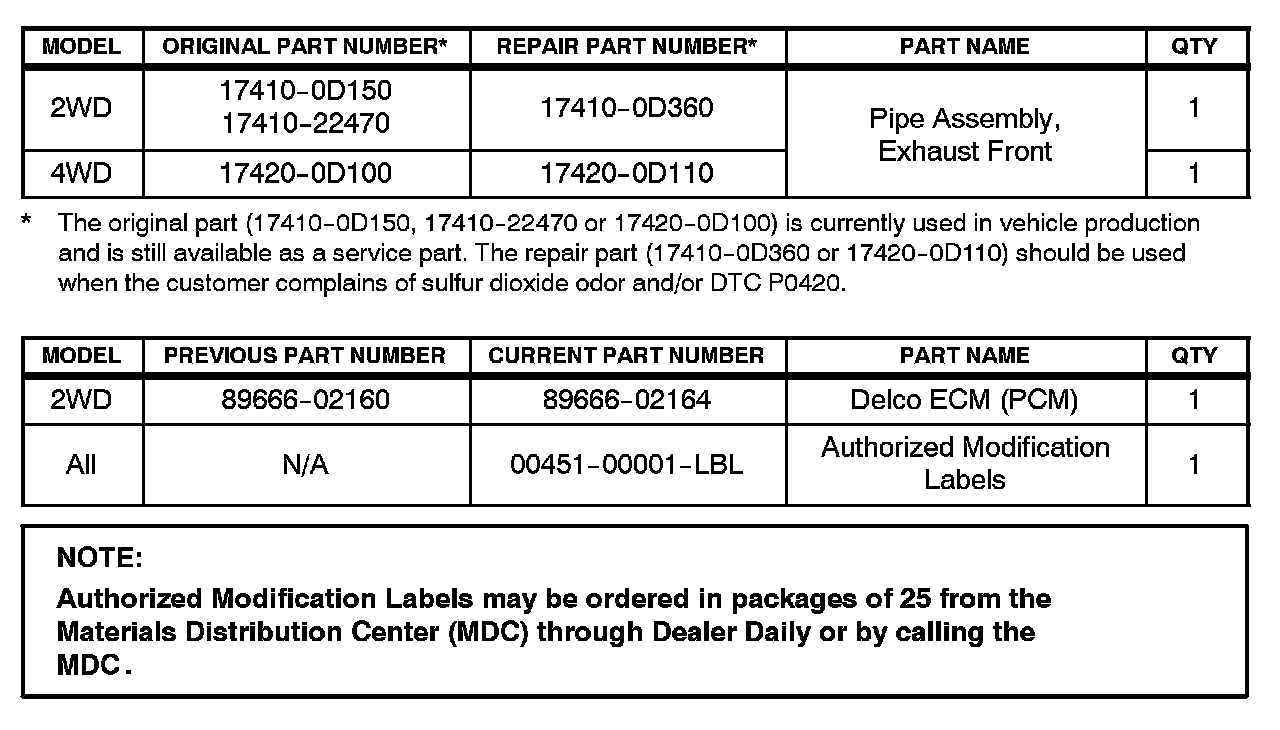 The repair procedure in this TSB is the same as TSB No. EG017-04 "Excessive Sulfur Dioxide Odor." This repair should only be performed once.