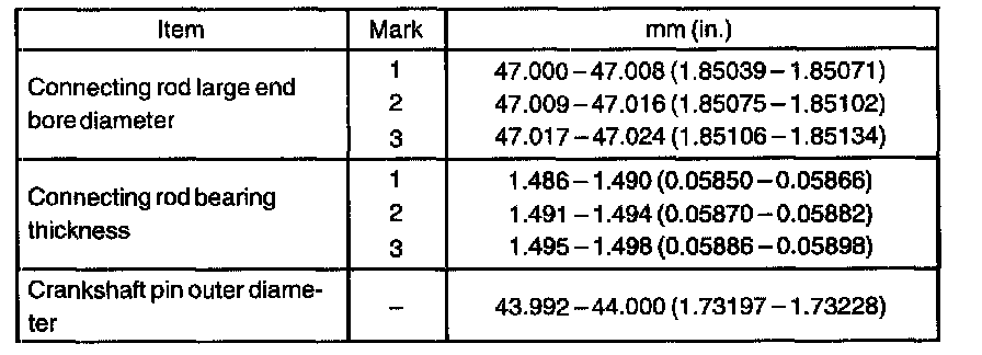 HINT: If replacing a bearing, select a new one having the same number as marked on the connecting rod. There are 3 sizes of standard bearings, marked "1", "2" and "3" accordingly.