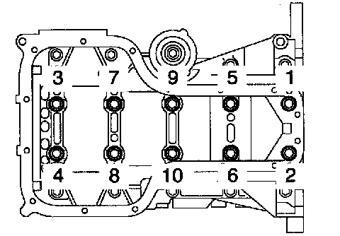 b. Uniformly loosen the 10 bearing cap bolts, in several passes, in the sequence shown in the illustration.