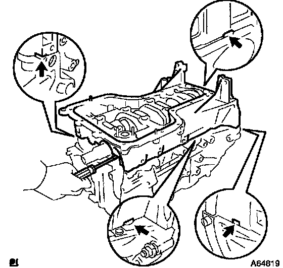 c. Using a screwdriver, remove the bearing cap by prying the indicated portions between the cylinder block and bearing cap.