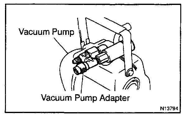 b. Connect the center hose of the manifold gauge set to the vacuum pump adapter.